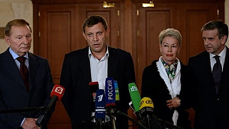 | Từ trái qua phải: Đại diện chính phủ Ucraina, cựu Tổng thống Ucraina Leonid Kuchma, Thủ tướng nước Cộng hòa nhân dân Donetsk tự xưng Alexander Zakharchenko, đại diện OSCE Heidi Tagkiavini và đại diện của Nga về Ucraina Mikhail Zurabov thông báo thỏa thuận ngừng bắn sau đàm phán.(ảnh: haaretz.com) |