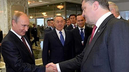 | Tổng thống Nga Putin gặp Tổng thống Ukraine Petro Poroshenko ở Minsk, Belarus. (Nguồn: irishtimes.com) |