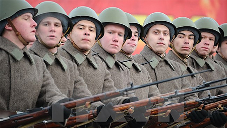 | Binh sỹ Nga trong trang phục Hồng quân Liên Xô trong Chiến tranh Thế giới lần thứ hai tham gia lễ duyệt binh tại Quảng trường Đỏ ở Moskva. (Nguồn: AFP/TTXVN) |