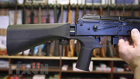 Thiết bị "bump stock" (trái) được gắn vào khẩu súng bán tự động AK-47 (phải) tại một cửa hàng ở bang Utah, Mỹ ngày 1/10/2017. Ảnh: AFP/TTXVN