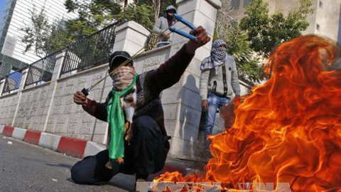 | Người biểu tình Pa-lét-xtin ném đá vào lực lượng an ninh Ít-xra-en, phản đối quyết định của Tổng thống Mỹ công nhận Giê-ru-sa-lem là thủ đô của Ít-xra-en tại Thành phố Hê-brôn, Khu Bờ Tây ngày 8-12-2017. Ảnh: AFP/TTXVN |