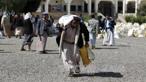 | Người dân nhận thực phẩm cứu trợ tại Sanaa, Yemen ngày 7/6/2017. Ảnh: AFP/TTXVN |