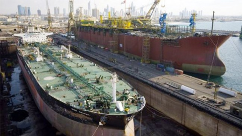 | Tàu chở dầu Iran Abadan của I-ran (bên trái) cập cảng Đu-bai của UAE. Ảnh CNBC |