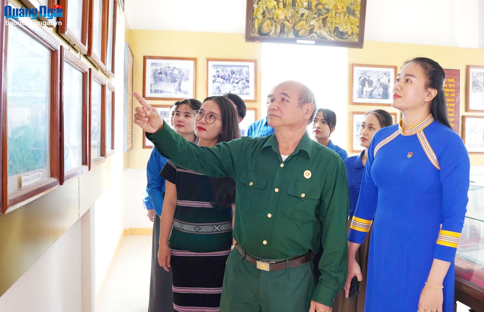 | Chủ tịch Hội Cựu chiến binh huyện Ba Tơ Phạm Văn Viên giới thiệu những hình ảnh, tư liệu về Cuộc Khởi nghĩa Ba Tơ. |