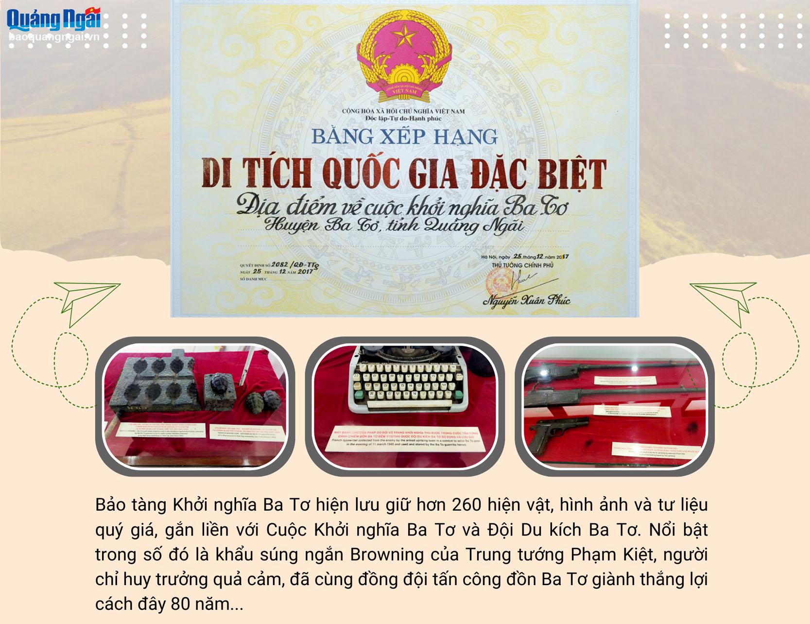 Cùng với những di tích lịch sử, mỗi dịp tháng Ba về, Bảo tàng Khởi nghĩa Ba Tơ lại đón hàng nghìn lượt khách đến tham quan, tìm hiểu. Trước sa bàn tái hiện cuộc khởi nghĩa, anh Nguyễn Đức Phong - phụ trách Bảo tàng Khởi nghĩa Ba Tơ say sưa kể lại những thời khắc lịch sử trọng đại, khi ngọn lửa cách mạng bùng lên ở đây và lan rộng khắp nơi. Người dân và du khách lặng lẽ lắng nghe, xúc động như được trở về với những ngày tháng hào hùng. Gắn bó 20 năm với Bảo tàng Khởi nghĩa Ba Tơ, anh Phong đã dẫn biết bao đoàn khách đến với vùng đất lịch sử này, kể lại những câu chuyện về Khởi nghĩa Ba Tơ năm xưa. Thế nhưng, mỗi lần nhắc đến, anh vẫn không khỏi bồi hồi xúc động. Đây không chỉ là mốc son trong lịch sử cách mạng Việt Nam, mà còn là biểu tượng sáng ngời của tinh thần quật khởi, lòng yêu nước sắt son của quân và dân Ba Tơ.