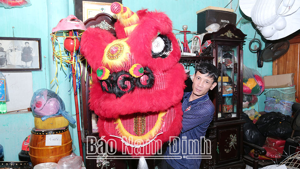 Tầng 2 số nhà 75, phố Hai Bà Trưng có 1 gian trang nghiêm thờ quan Cửu phẩm Trần Văn Thuỷ, người được coi là “tổ nghề” hàng mã, đồ thêu ở thành phố Nam Định xưa kia. Ông Thuỷ vốn người gốc Huế, được triều Nguyễn sắc phong, ban đất ở Nam Định rồi về Thành Nam sinh cơ lập nghiệp. Anh Trần Anh Phong là đời thứ 5 trong dòng họ Trần nối nghiệp nghề xưa. Trước đây, khi mẹ anh còn khoẻ, nhà anh giống như một “tổ hợp” sản xuất thu nhỏ gồm xưởng may thêu và khu vực làm đồ hàng mã. Những năm đầu đổi mới, mẹ anh, bà Phạm Thị Chương còn được biết đến với vai trò là chủ nhiệm một hợp tác xã (HTX) thêu có tiếng ở Thành Nam. Thêu cờ, phướn, theo bà Chương đòi hỏi người thêu phải am hiểu chữ Nôm và có kỹ thuật thêu đủ "tứ linh" long, ly, quy, phượng… mới cho ra sản phẩm tốt. Tuổi cao, bà Chương hiện đã nghỉ công việc thêu thùa, hàng ngày ngồi bán hàng mã, rảnh rỗi thì xem con cháu làm lân, rồng, sư tử. Để làm hoàn chỉnh một con lân, sư tử, rồng có kích thước cỡ vừa, anh Phong mất khoảng 7 ngày “cật lực”. “Kỹ” trong từng công đoạn, các sản phẩm do gia đình anh Phong làm ra được thị trường đánh giá cao, có giá bán trung bình từ 3,5-7 triệu đồng/sản phẩm. Anh cũng từng làm các con lân, rồng lớn phục vụ những sự kiện Đại lễ 1.000 năm Thăng Long (Hà Nội), lễ hội Đền Trần hàng năm…