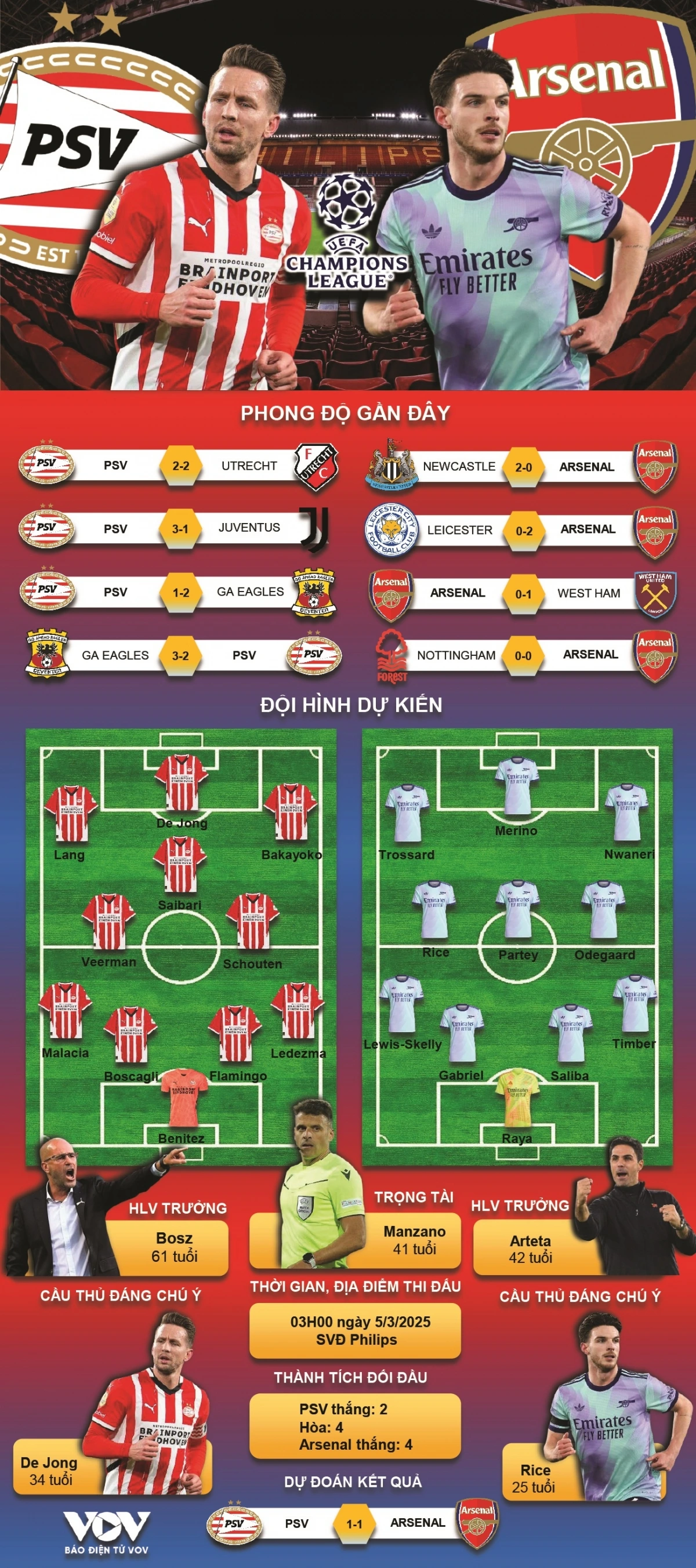 Dự đoán kết quả và đội hình ra sân trận PSV vs Arsenal, thuộc khuôn khổ lượt đi vòng 1/8 Cúp C1 châu Âu 2024/2025 diễn ra lúc 03h00 ngày 5/3.