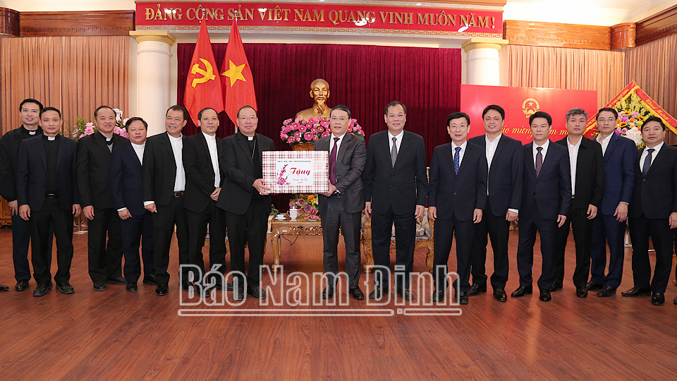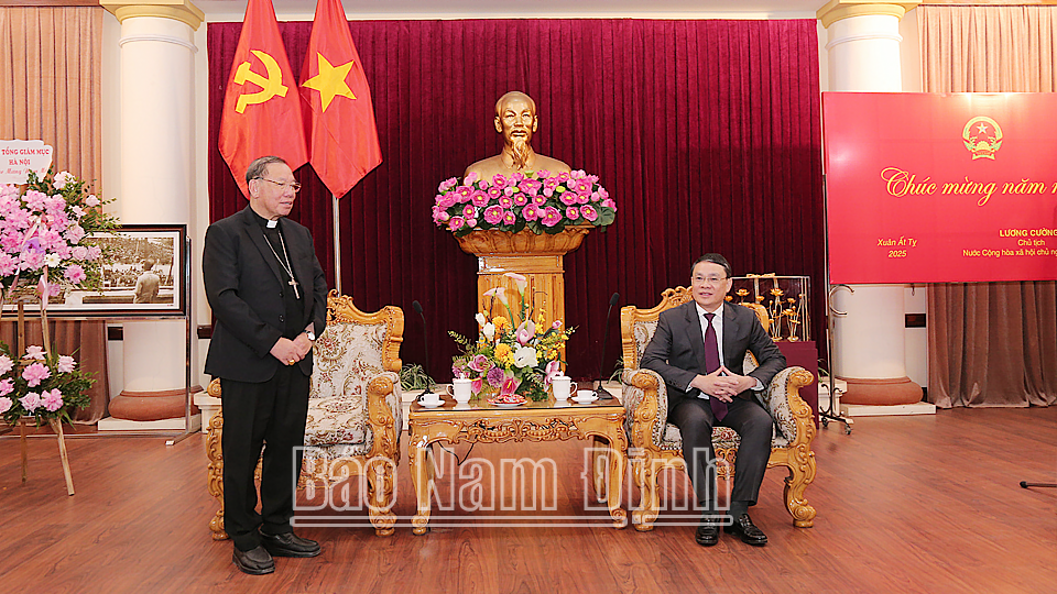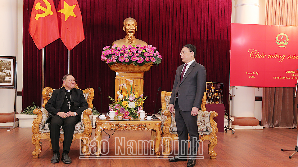 Nhân kỷ niệm 95 năm Ngày thành lập Đảng Cộng sản Việt Nam (3/2/1930 – 3/2/2025) và đón Tết Nguyên đán Ất Tỵ 2025, sáng 17/1, tại trụ sở Tỉnh ủy, các đồng chí: Đặng Khánh Toàn, Bí thư Tỉnh ủy; Lê Quốc Chỉnh, Phó Bí thư Thường trực Tỉnh ủy, Trưởng đoàn Đoàn đại biểu Quốc hội tỉnh, Chủ tịch HĐND tỉnh; Phạm Đình Nghị, Phó Bí thư Tỉnh ủy, Chủ tịch UBND tỉnh đã tiếp Đoàn đại biểu Tòa Tổng Giám mục Tổng giáo phận Hà Nội do Đức Tổng Giám mục Giuse Vũ Văn Thiên làm Trưởng đoàn đến chúc mừng. Cùng dự có các đồng chí Ủy viên Ban TVTU: Trần Minh Thắng, Chủ tịch Ủy ban MTTQ tỉnh; Phạm Duy Hưng, Trưởng Ban Dân vận Tỉnh ủy; Đại tá Nguyễn Hữu Mạnh, Giám đốc Công an tỉnh; lãnh đạo Văn phòng Tỉnh ủy, Sở Nội vụ và thành phố Nam Định.